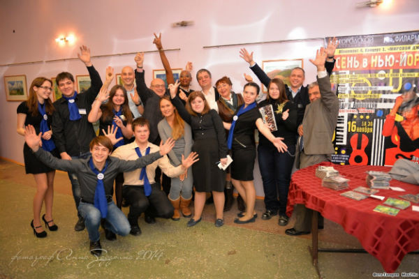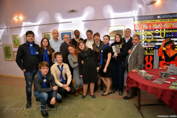 На фото – встреча волонтеров г. Асбест с артистами (Концерт абонемента «Мировой джаз». Лесли Харрисон, Ваагн Айрапетян, Сергей Васильев, Давид Ткебучава)