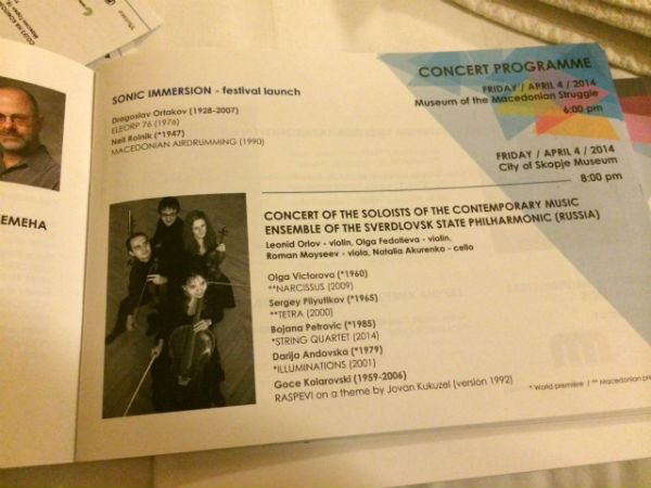 Свою фестивальную программу струнный квартет в составе – Леонид Орлов, Ольга Федотьева, Роман Моисеев и Наталья Акуренко, открыли музыкой известного македонского композитора Гоце Коларовского. Его пьеса«Распевы», за которой последовали «Иллюминации» Дарьи Андовской, струнные квартеты Бояны Петрович и Сергея Пилютикова, «Нарцисс», «Пепел и алмаз» Ольги Викторовой, стала своеобразным эпиграфом к концерту в целом. Ровное звучание культовых церковных распевов в контрасте с высоко эмоциональным музыкальным высказыванием стало основой, объединившей славянскую в своей глубинной сути музыку российcких и македонских композиторов.
